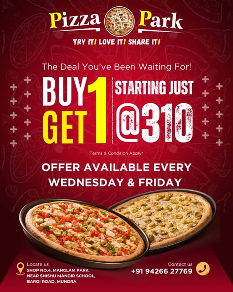 🍕 Yes, you read that right! Every Wednesday & Friday, indulge in your favorite cheesy bites at unbeatable prices! 🎯 This Week’s Hot Deals: ▪️ 2 Small Premium Pizzas – ₹310 ▪️ 2 Medium Premium Pizzas – ₹550 ▪️ 2 Small Deluxe Pizzas – ₹360 ▪️ 2 Medium Deluxe Pizzas – ₹590 📆 Only on Wednesdays & Fridays 📍 Available at Pizza Park – Where taste meets value! 📞 Call to order now: +91 94266 27769