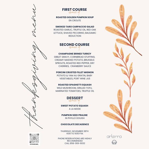 🍂 Got Thanksgiving plans yet? Join us at Arterra for an unforgettable three-course feast! Let us handle the cooking while you enjoy the holiday. Reservations by phone are highly encouraged! (858) 369-6032