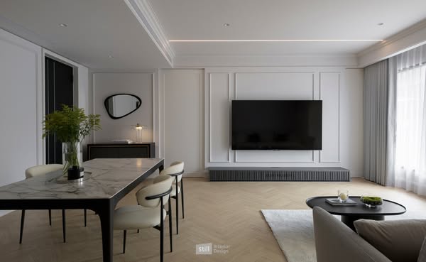 空間中融入了法式線板元素,細節設計賦予了空間獨特的風采和韻味。大面積留白的配色與黑色、金色的點綴交相輝映,營造出了極具現代感和奢華感的氛圍。空間充滿了生活的氣息,開放式的廚房貼合了屋主的生活開放需求,書房以敞開與門片阻隔的方式,滿足了不同場合的使用需求。白色與線板的搭配展現出法式極簡的風格,使整個空間顯得更加純淨、優雅。