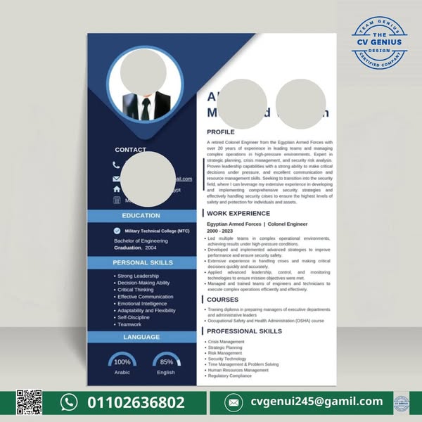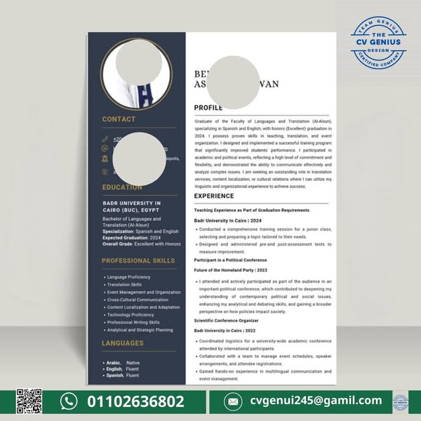 ✅ كل CV عندنا بيتصمم بناءً على بياناتك وخبراتك، مش مجرد قوالب جاهزة، علشان كل HR بيقيمك من الـ CV الخاص بيك. لازم يكون مصمم بعناية لتجنب الأخطاء، وإحنا بنسلط الضوء على نقاط قوتك علشان تظهر لأصحاب العمل وتكون مميزًا بين المتقدمين.