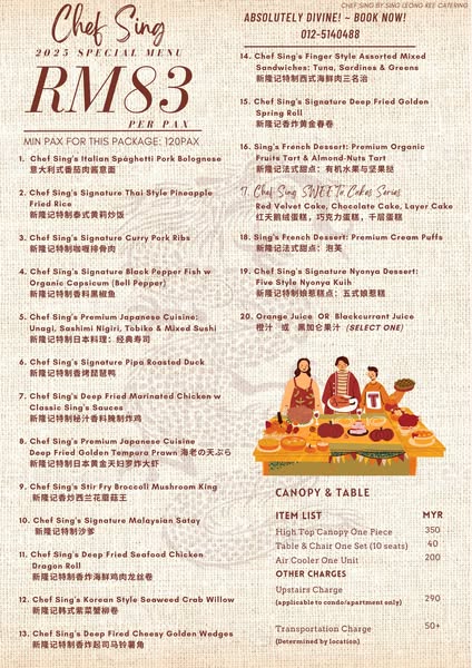 搜索关键词 Penang catering services, wedding buffet Penang, birthday party catering, Sing Leong Kee, new house celebration, 2025 buffet menu, company event catering, Penang buffet dinner, catering packages优势 New buffet menu for 2025,Suitable for weddings, birthday parties, housewarming,Packages for big company events available,Easy contact via Facebook, WhatsApp, and phone