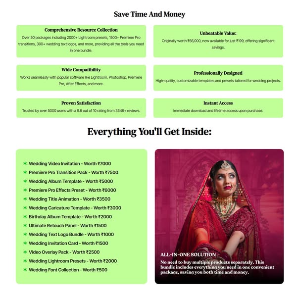 ✅ 500+ Lightroom Presets: Perfectly edit photos with ease. ✅ 2000+ Overlays & Effects: Add a unique touch to your images and videos. ✅ 1000+ LUTs: Achieve stunning cinematic color grading. ✅ 3000+ Photoshop Actions: Streamline your editing process. ✅ 1000+ Backgrounds & Textures: Create captivating photo backgrounds. ✅ 1000+ Stock Photos: Access premium wedding-themed images. ✅ 800+ Royalty-Free Music Tracks: Enhance wedding videos with perfect soundtracks. ✅ 500+ Video Tutorials: Learn and master photography and videography skills. ✅ 1500+ Customizable Templates: Design beautiful wedding albums and more. Exclusive Bonuses: ✅ Posing Guides: Get professional tips for perfect wedding poses. ✅ Lighting Techniques: Master lighting for stunning photos. ✅ Client Management Tools: Streamline your workflow and client interactions. ✅ Marketing Resources: Boost your business with effective marketing templates. Special Offer: Only ₹299! (Regular Price ₹12999)