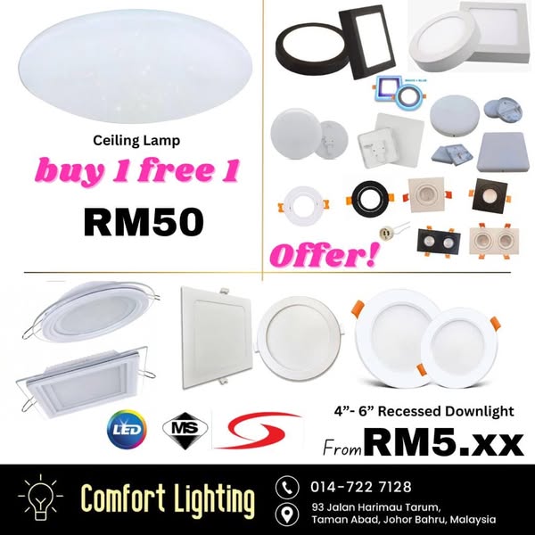 搜索关键词 comfort lighting, electrical appliances, ceiling fans, lighting deals, home renovation, Johor Bahru, singapore brand, chandelier fan, water heater, led lights优势 One-stop hub for lighting and electrical needs,Wide range of products from low to high price ranges,Limited time deal