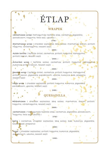 搜索关键词 Bisztró ételek italok, finom étel italok, Hungarian bistro food, food and drinks, good restaurant, limited time offer, dinner and drink, hungary food优势 Finom ételek,Változatos italok,Hosszú nyitvatartás