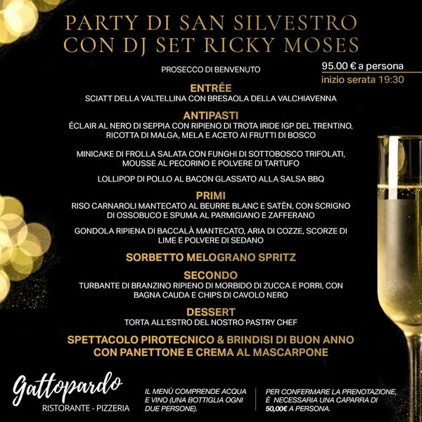 搜索关键词 New Year's Eve, Bergamo party, Italian restaurant, DJ music, anniversary celebration, Gattopardo dinner, San Silvestro, online booking, holiday event, restaurant promotion优势 High-quality menu,Live DJ music (Ricky Moses),25th anniversary celebration,Easy online booking