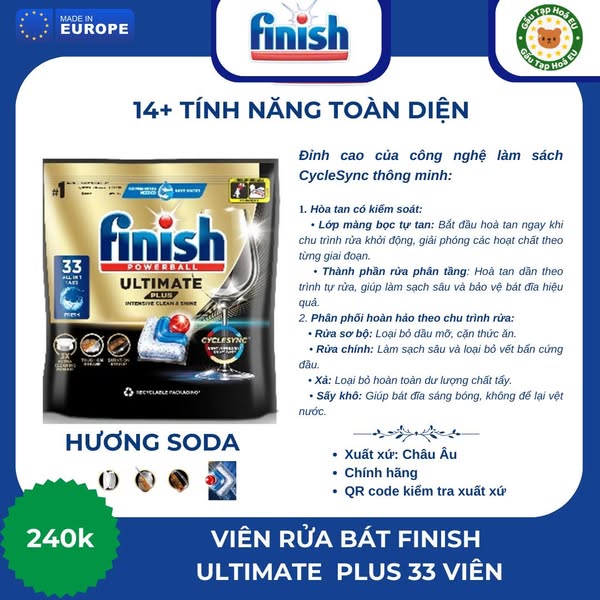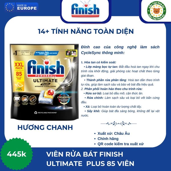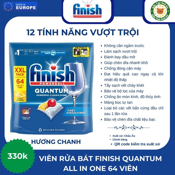搜索关键词 Finish dishwasher tablets, dishwasher detergent, dish cleaning, European import, Hanoi free ship, durable dishwasher, clean dishes, eco friendly, Finish Quantum, Finish Ultimate优势 Superior cleaning power,Protects dishes and dishwasher,Imported from Europe,Various product lines available (Classic, Power All in One, Gel Eco, Quantum, Ultimate),Free shipping in Hanoi for purchases of 2 or more items