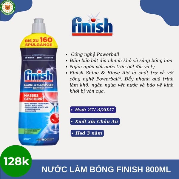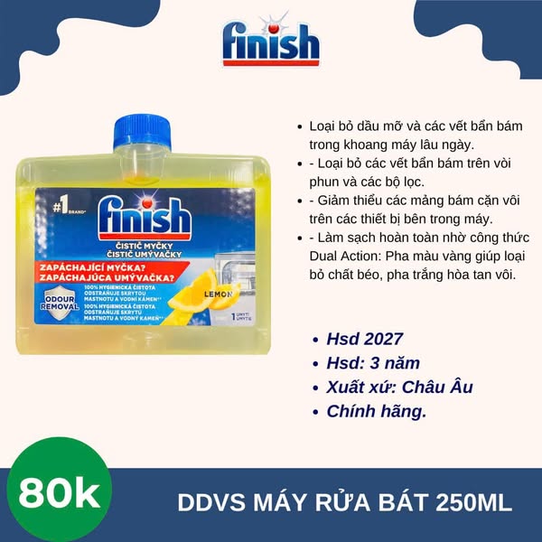 Finish là thương hiệu số 1 toàn cầu trong lĩnh vực sản phẩm rửa chén tự động. Được khuyên dùng bởi các hãng máy rửa chén hàng đầu như Bosch, LG, Samsung, Finish phù hợp với tất cả các dòng máy rửa bát hiện nay. Sản phẩm của Finish giúp làm sạch bát đĩa hiệu quả, bảo vệ máy rửa bát, và mang lại độ sáng bóng cho đồ dùng nhà bếp.