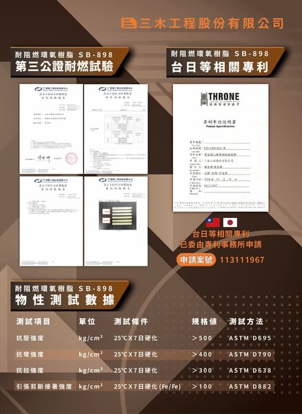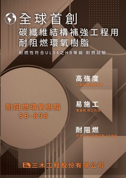 搜索关键词 碳纖維補強 resin, 耐阻燃 epoxy, 工程建材 sales, UL94 standard, 三木工程 contact优势 碳纖維補強專用,耐阻燃,通過美國UL94耐燃測試