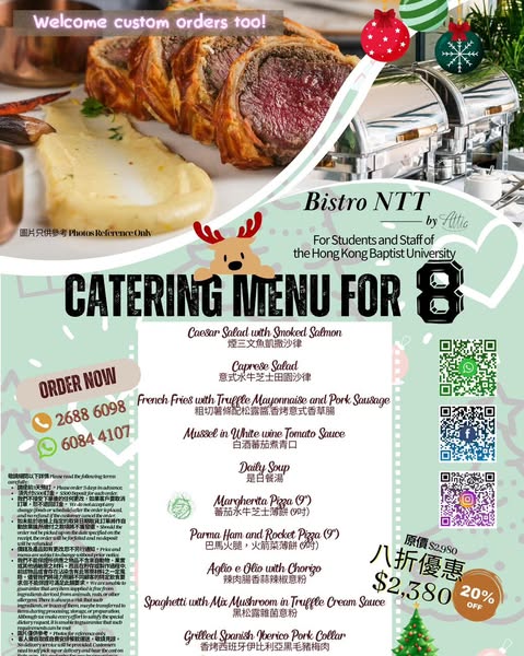 搜索关键词 Christmas catering, New Year delivery, Kowloon Tong food, HK catering service, Bistro NTT, Wellington beef, party catering, takeaway food, Kowloon City restaurant, Christmas takeaway优势 精致美食,适合聚会,提供外卖和到会服务,可定制菜单,招牌菜威灵顿牛柳
