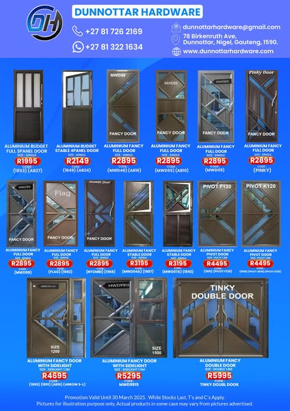 搜索关键词 home improvement, hardware store, dunnottar hardware, pvc ceiling, interior doors, exterior doors, tile design, home renovation, DIY projects, painting projects优势 Wide range of products,Seasonal sale prices,Open 7 days a week, including weekends and public holidays,Online shopping available,Multiple contact options (WhatsApp, Phone)