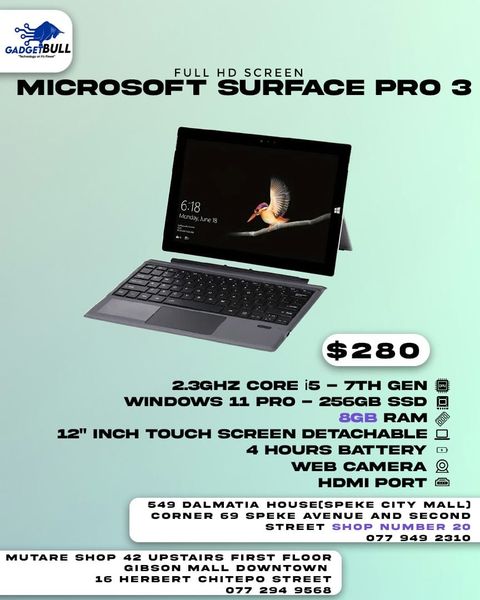 搜索关键词 Microsoft Surface Pro, Surface Pro 3, i5 i7, 256GB SSD, Speke City Mall, Laptop Tablet, Computer Sale, Zimbabwe Tech, Portable Computer, Hybrid Device优势 Powerful Processor Options (i5, i7),256GB SSD Storage,Portable and Versatile