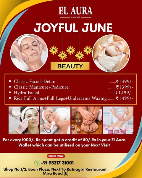 #ElAuraSalons #JoyfulJune #SalonOffers #MiraRoadSalon #Nanoplastia #KeratinTreatment #BotoxHairTreatment #HydraFacial #ManicurePedicure #HairSpa #HairCareDeals #FacialTime #MiraRoadBeautySalon #MumbaiSalonDeals #SalonDiscounts #JuneSpecials #SelfCareMonth #BeautyOnBudget