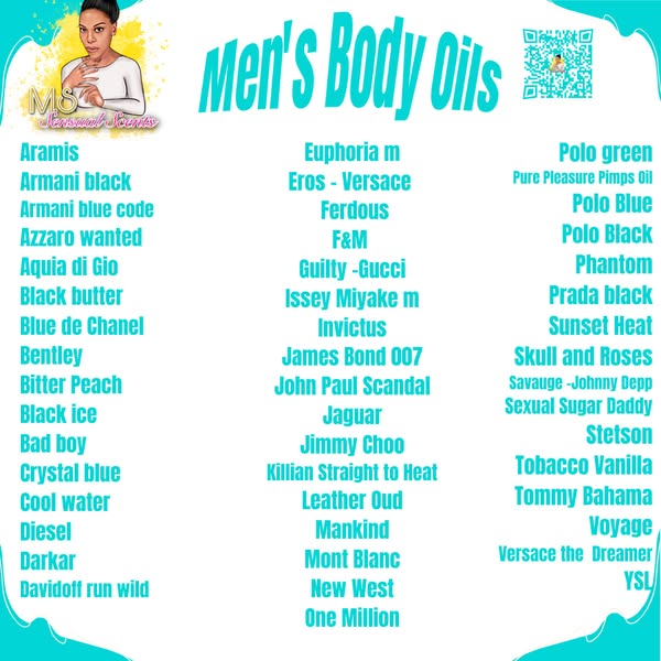 We specialize in and carry a wide variety of beard oils, body oils, burning oils, cologne oils, diffuser oils, essential oils, fragrance oils, fruit scent oils, floral scent oils, massage oils, musk oils, perfume oils, religious oils, spiritual oils, and more!