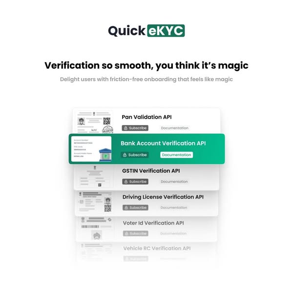Build Faster. Verify Smarter. QuickeKYC – Trusted eKYC API Stack for Fintech & Developers QuickeKYC empowers developers, fintech startups, software companies, and app/web development teams with powerful, production-ready eKYC APIs to accelerate secure user onboarding. Whether you're a senior developer building fintech apps or a growing software firm working with clients in finance, lending, or digital services, our suite includes Aadhaar eKYC, PAN verification, GST number validation, and bank/UPI account check — all under one blazing-fast, secure platform. Designed to support from 500 to 50,000+ verifications per month, QuickeKYC ensures regulatory compliance, real-time performance, and seamless integration for serious builders. 🔖 #eKYCAPI #AadhaarVerification #PANVerificationAPI #GSTAPI #BankAccountValidation #UPIValidationAPI #FintechIndia #DeveloperTools #SoftwareDevelopmentIndia #AppVerificationAPI #QuickeKYC #SecureKYC #DigitalOnboarding