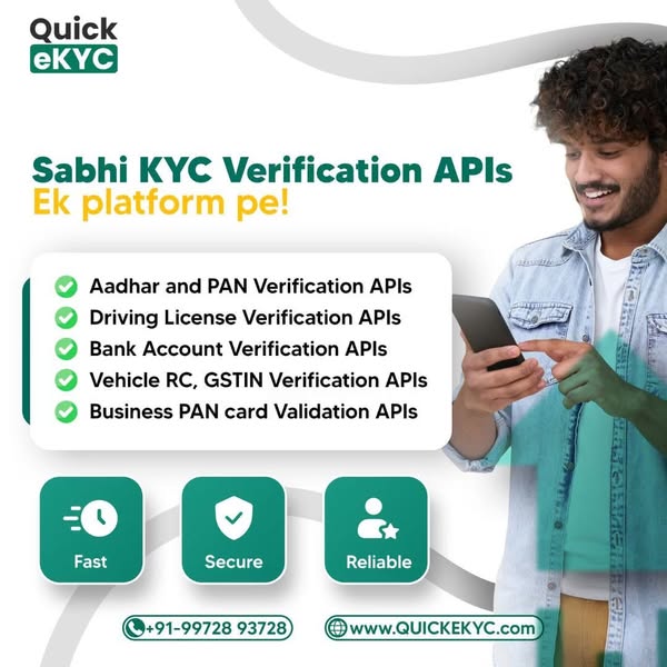 🚀 Build Fintech, Android & SaaS Apps Faster with QuickeKYC – India’s Most Complete API Stack for Aadhaar, PAN, Bank, UPI, GST & More 💼 One API Stack for All Your KYC Needs – Aadhaar, PAN, Bank, UPI, GST, Voter ID, DL, RC, Face Match, AML & More – Built for Developers & Fintech 🔐 QuickeKYC – Your Ultimate KYC Engine for Android Apps, Web Platforms & Fintech Startups: 15+ APIs in One Powerful Integration 🛠️ From Aadhaar to AML – One Secure, Scalable eKYC API Suite Trusted by 500+ Apps, Wallets, CRMs & Software Builders Across India 📲 The Only KYC API Stack You Need for Android Apps, Web Projects & Fintech Tools – Fast, Secure, UIDAI & RBI Compliant 🚀 QuickeKYC: One-Stop KYC API Stack for Developers – Aadhaar, PAN, Bank, UPI, Face Match, OCR, AML, GST, DL, RC & More – Go Live in Minutes 📦 Launch Smarter Digital Products with QuickeKYC – The Full-Stack KYC Verification API Suite for Apps, CRMs, Tax Tools & Payout Platforms 💡 Power Every App, Platform or Portal with QuickeKYC – A 360° API Suite for Fast, Secure & Compliant Aadhaar, PAN, Bank, GST & Identity Verification All-in-One eKYC API Suite for Fintech, Apps & SaaS | Aadhaar, PAN, UPI, Bank, GST, Mobile, Email & More – Secure, Scalable, Developer-Ready 🔐 Want to onboard real users, reduce fraud, and verify identities in seconds — not hours? With QuickeKYC, you get India’s most complete eKYC API stack — built for scale, speed, and compliance. No fluff, no delays. Just clean, secure APIs trusted by 500+ apps, wallets, and lending startups. Whether you're building a digital loan app, UPI payout system, wallet, GST platform, or driver onboarding app — QuickeKYC is your backend identity engine. ✅ Aadhaar eKYC API – OTP-based verification via UIDAI – Supports VID, Masked QR – UIDAI-compliant for real-time identity checks ✅ PAN Verification API – Name & DOB match with NSDL – Tax-compliant, ideal for loans & fintech onboarding ✅ Bank Account Verification API – Penny Drop + UTR or Penny-less Name Match – Verifies account holder before payouts, refunds, salaries ✅ UPI ID Verification API – Validates UPI handle & matches account name – Prevents failed transactions and fraud ✅ GSTIN Verification API – Fetches business name, type, registration date & status – Powerful for SME onboarding, vendor checks & invoice tools ✅ Mobile Number Verification API – Checks number validity, format, and telecom association – Useful for onboarding, alerts, & fraud control ✅ Email ID Verification API – Detects invalid or disposable emails in real-time – Reduces bounce rates & fake signups ✅ Voter ID Verification API – Verifies electoral roll & ID details for real user confirmation ✅ Driving License (DL) Verification API – VAHAN-integrated to validate license ownership & status ✅ RC (Vehicle Registration) Verification API – Matches vehicle number to owner & registration status ✅ AML Risk Score API – Flags high-risk users based on data signals & compliance models ✅ Face Match API – AI-powered selfie-to-ID comparison for fraud detection ✅ Liveness Detection API – Detects spoofing, photo uploads, or fake video checks ✅ OCR API – Extracts text from Aadhaar, PAN, DL, Voter ID & more ⚙️ Why Developers & Fintech Teams Choose QuickeKYC: ✔️ Real-time response (<2 sec) ✔️ RESTful APIs with token auth ✔️ Postman collections + developer docs ✔️ Scales from 100 to 1 million+ verifications/month ✔️ RBI, UIDAI, SEBI & AML compliant ✔️ Wallet-based pricing – pay only for what you use ✔️ 24x7 support for verified B2B users 🎯 Perfect for: Digital Wallets Recharge & DMT Platforms Lending & NBFC Apps GST & Invoicing SaaS Driver/EV Onboarding Fintech Startups App Development Agencies Compliance Automation Tools 📞 Ready to scale with India’s fastest eKYC stack? 📲 WhatsApp Us: +91-99728 93728 🌐 Visit: