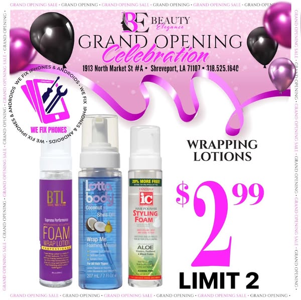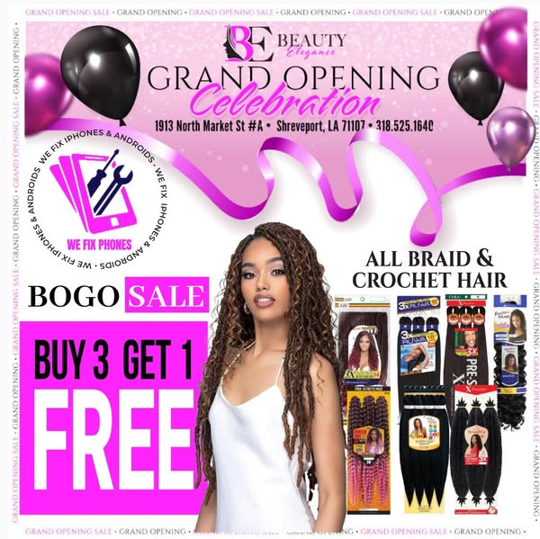 搜索关键词 beauty products, grand opening, hair care, makeup essentials, Shreveport LA, Bossier City, human hair wigs, iphone giveaway, store credit优势 Up to 80% OFF,Wide selection of products,Giveaways (wigs, bundles, iPhone, store credit, screen repair)