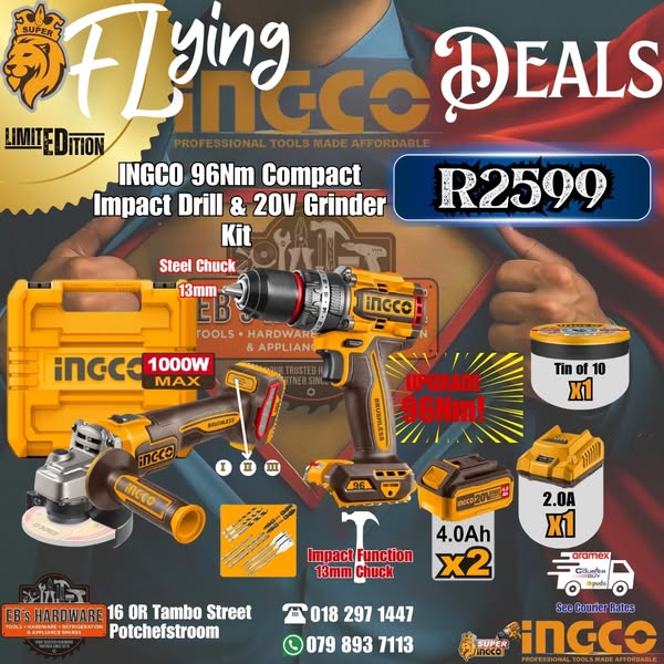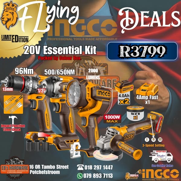 搜索关键词 INGCO power tools, Toyota Gazoo Racing, cordless tools, power tool promotion, tool specials, hardware deals, EB's Hardware, South Africa tools, INGCO 20V, Dakar Rally Tools优势 Wide range of tools,Official Tools Partner to Toyota Gazoo Racing,Nationwide Courier,In-store availability,Special Deals and Promotions
