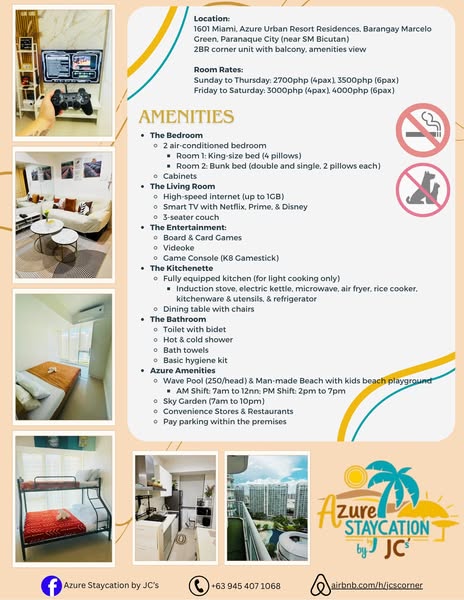 搜索关键词 Azure staycation, Manila resort, urban resort, family staycation, Manila Airbnb, Wave pool resort, near airport, Manila vacation, cheap staycation, legit staycation优势 Legitimate and Scam-Free,Highly Rated Hosts,Comprehensive Amenities: Wave Pool, Beach, Karaoke, Netflix,Convenient Location near Airport & Malls,Competitive pricing