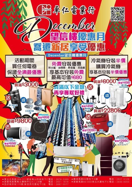 卓仁電器已參與“全城消費大獎賞”活動🎉在活動期間(30/9/2024-29/12/2024),周一至周五在全澳商戶單筆用手機支付滿$50元,即可抽取電子優惠(優惠券包括$10,$20,$50,$100)3次,於緊接的周六、日即可到卓仁電器及其他參與計劃的商戶進行使用🥳 (電子優惠每周一凌晨清零,逾期視作失效 )