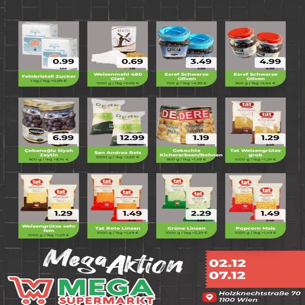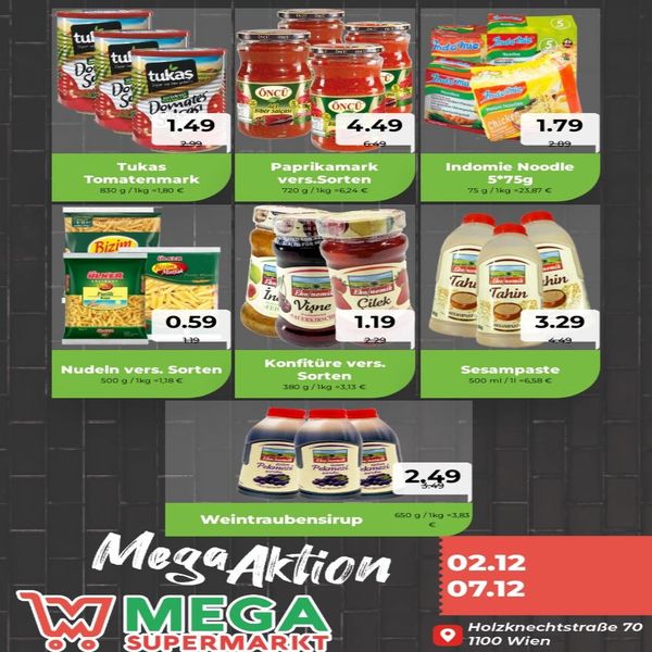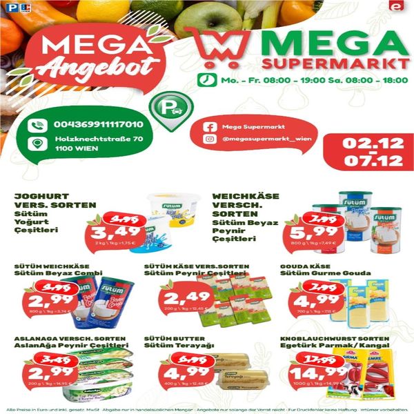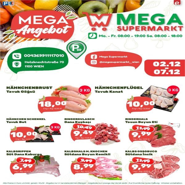 搜索关键词 Mega Supermarkt, Wien Angebote, Lebensmittel Aktion, Frische Qualitat, Supermarkt Promotion, Guenstiges Einkaufen, Holzknecht Strasse, Lebensmittel Geschaeft, Oesterreich Supermarkt, Supermarkt Angebote优势 新鲜,高质量,有效期至 07.12.2024
