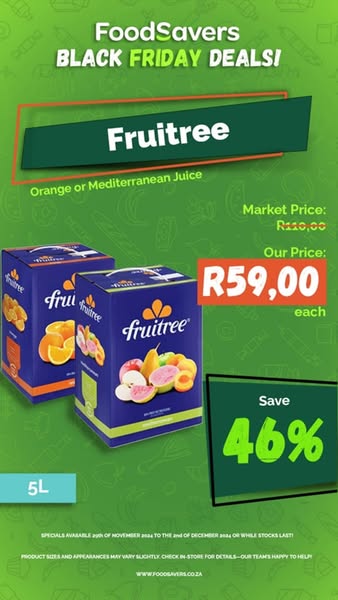 搜索关键词 Black Friday deals, FoodSavers specials, November savings, December savings, Pretoria shopping, Food specials, Grocery discounts, Limited time offer, Kolonnade shopping centre, South Africa grocery优势 大幅折扣 (平均 53% OFF),多种商品参与活动,活动时间明确 (29 Nov - 8 Dec)