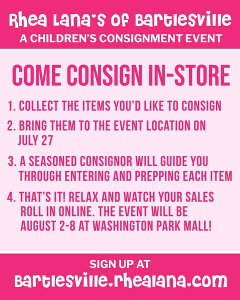 搜索关键词 Children's consignment, Kids clothing sale, Baby gear bargains, Washington Park Mall, Discount children's items, Rhea Lana's event, Back to school clothes, Family shopping event, Bartlesville OK, Mom's day out优势 High-quality kids' items,Unbeatable prices (60-90% off),Wide selection of items,New inventory daily
