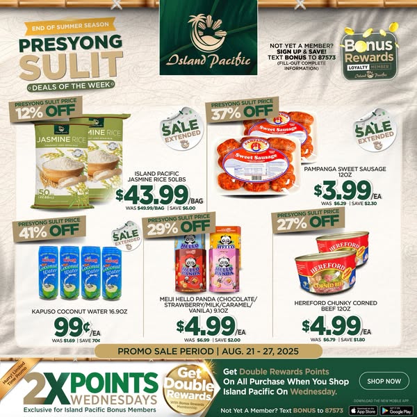 🇵🇭🛒 Mga Kababayan, enjoy #PresyongSulit Deals on Meat, Seafood, Produce and your favorite Filipino grocery products from August 21-27, 2025 at Island Pacific!