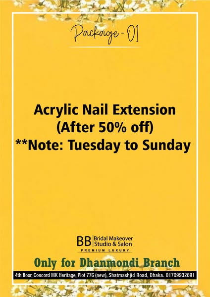 搜索关键词 salon services, 50% off, beauty treatment, dhaka salon, hair color, skin care, nail care, spa treatment, relaxing massage, premium luxury优势 50% Off on all services,Wide range of services (hair, skin, nail, spa),Professional and experienced team,High-quality products & hygiene,Relaxing Ambiance