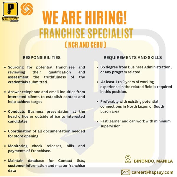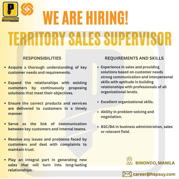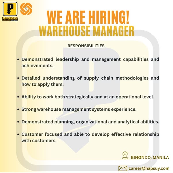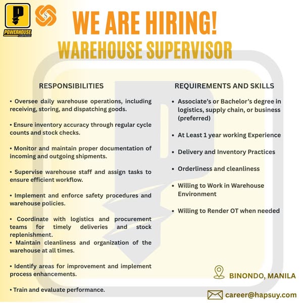 搜索关键词 hardware store jobs, Hap Suy careers, Binondo Manila jobs, Powerhouse tools hiring, customer service jobs, sales positions available, operations team openings, career opportunities Philippines, growing team recruitment, dynamic team positions优势 Growth opportunities,Teamwork environment,Customer service focus
