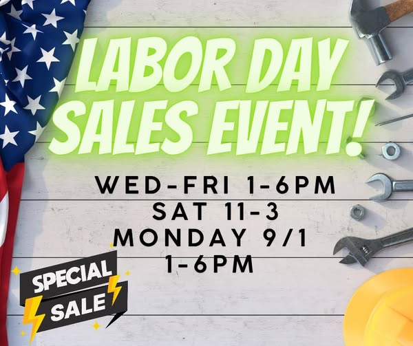 We will be open Wednesday through Friday 1-6pm and Saturday 11-3 AND MONDAY 9/1 FROM 1-6PM