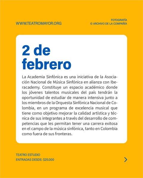 搜索关键词 sinfónica concierto, teatro mayor, colombia eventos, música clásica, iberacademy alliance, academia sinfónica, febrero 2, música sinfónica, national symphony, cultural event优势 Presentación de artistas formados en un programa de excelencia musical.,Alianza con la Asociación Nacional de Música Sinfónica e Iberacademy.,Presentado en el prestigioso Teatro Mayor.