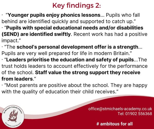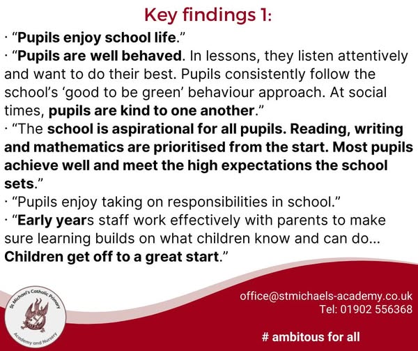 I am delighted to say that St Michael's remains a GOOD school and I am very proud of all of our staff and (most importantly) pupils. 😀