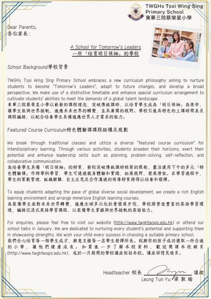 Our school will hold two similar sessions of Seminar on “Central Allocation” Primary Admission Strategy and School Introduction on 4/1/2025 and 12/1/2025. Please refer to the leaflet for details and application.