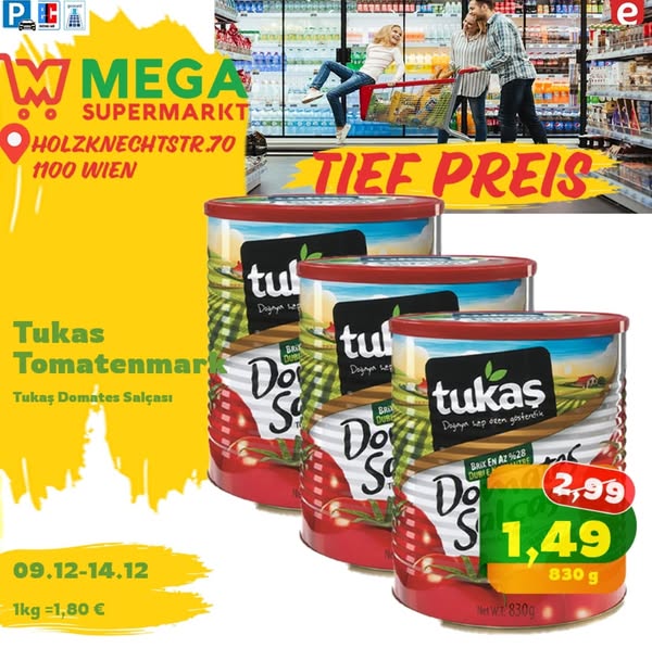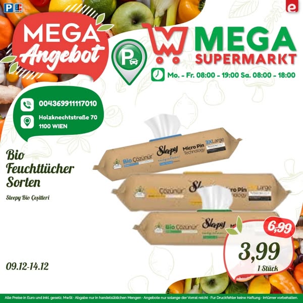 搜索关键词 Mega Supermarkt, Wien Angebote, Frisch Qualität, Lebensmittel Angebote, Günstig Einkaufen, Supermarkt Angebote, 1100 Wien, Holzknecht Strasse, Limited Stock, Valid Until 2024优势 新鲜,高品质,有效期到2024年12月14日,多种商品可选