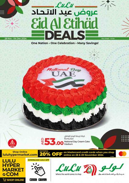 搜索关键词 Lulu Hypermarket, Eid Al Etihad, UAE National Day, Abu Dhabi deals, Al Ain promotions, Online shopping, Grocery offers, Gadget sale, Clothing discount, Lulu UAE优势 多种商品选择,庆祝UAE国庆日,线上线下均可购买