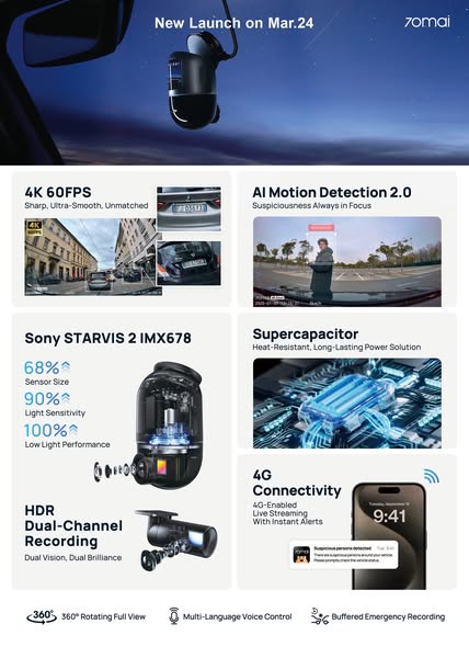 搜索关键词 70mai dash cam, high tech dashcam, 4K dash cam, car camera, car safety, driving recorder, vehicle monitoring, in-car recording, advanced driver assistance, automobile accessories优势 High Tech,4K recording