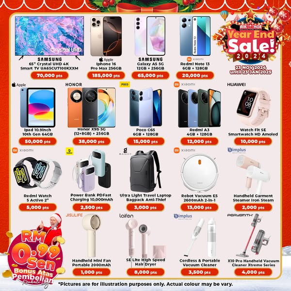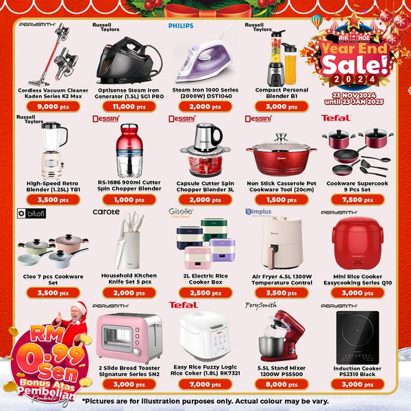 ** Terma & Syarat : Pembelian dari RM1,000 keatas dalam tempoh 23 Nov 2024 - 23 Jan 2025, anda layak membeli salah satu barangan Bonus dengan harga RM0.99 sahaja!