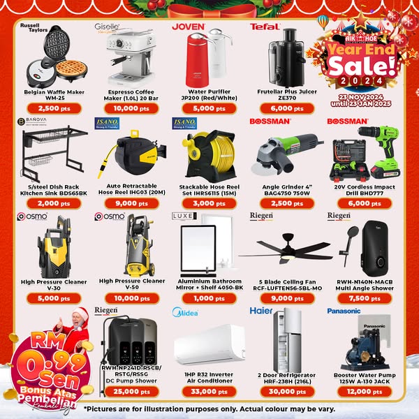 搜索关键词 year end sale, home appliances, building materials, Malaysia sale, Aik Hoe, discount offers, home improvement products, kitchen appliances, bathroom accessories, tiles promotion优势 Year-end sale with discounted prices,Bonus purchase at RM0.99 for qualifying purchases,Wide range of products available (electronics, gadgets, home improvement),Multiple locations in Kelantan and Terengganu