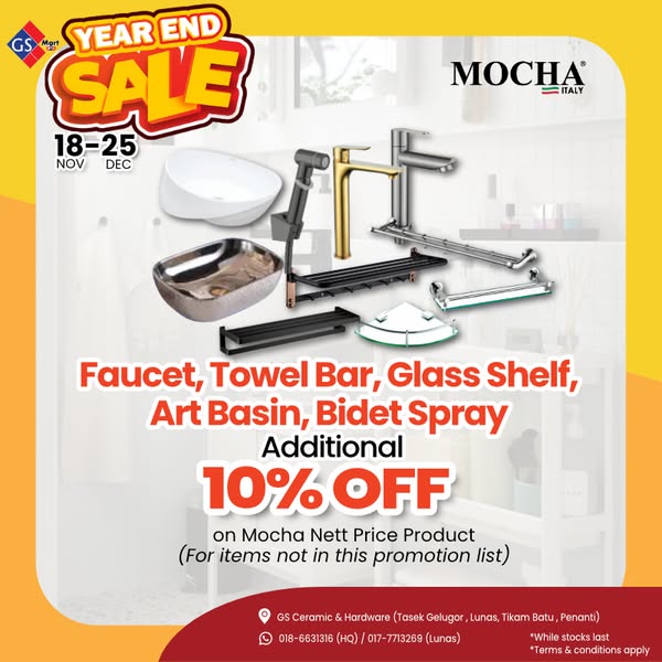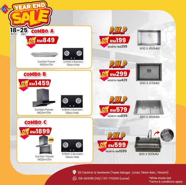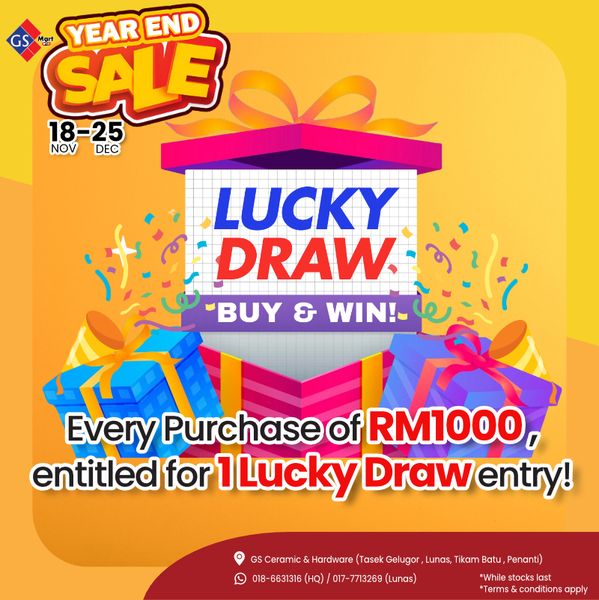 搜索关键词 year end sale, home appliances, tile specialist, lucky draw, malaysia promotion优势 Year End Sale with significant discounts,PWP (Purchase With Purchase) offers at RM1,Lucky Draw for purchases above RM1000,Quality products at reasonable prices,Ready stock directly from the factory,After-sales service,One-stop shop for home needs
