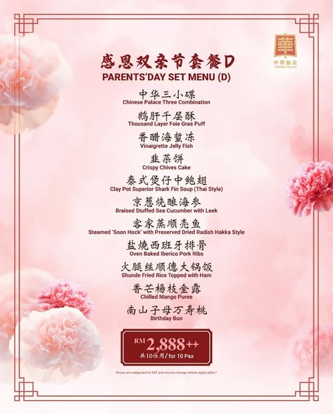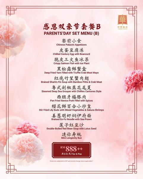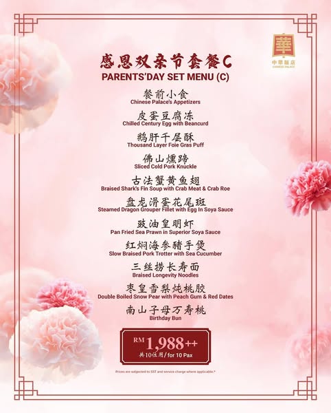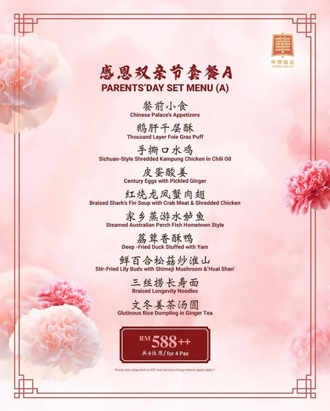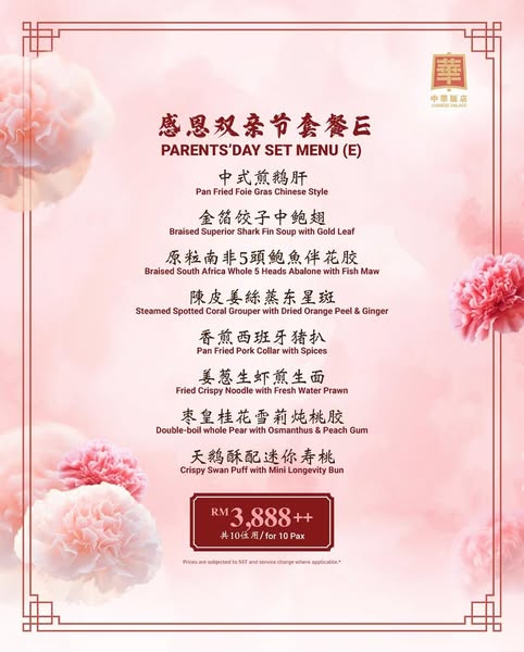搜索关键词 Chinese Palace, Mother's Day, Father's Day, Chinese Restaurant, Kuala Lumpur, Family Meal, Cantonese Cuisine, Special Offer, Parents Day Celebration, KL Foodie优势 Celebration of parents.,Special menu for Mother's & Father's Day.,Free rose for mothers (while stock lasts).,Warm and family-friendly atmosphere.