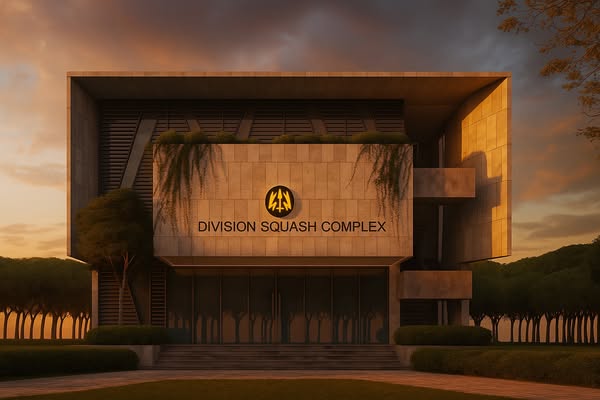 Nestled within the tranquil setting of Savar Cantonment, the Squash Complex rests gracefully on a north-facing rectangular plot, flanked by a serene pond on one side and a swimming pool on the other. The natural surroundings offer a calm, contemplative backdrop that contrasts with the vigorous spirit of the sport.