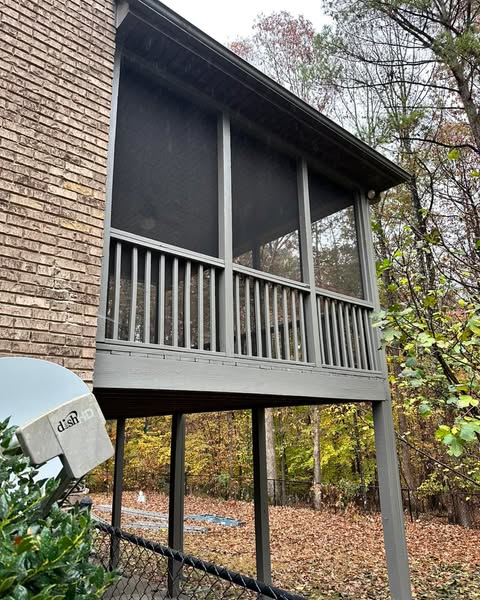 This exterior transformation brought new life to this screened-in porch, stairs, deck, and garage doors. What started as a mix of worn red and fading finishes is now a cohesive, modern look in a rich neutral tone that complements the brick exterior beautifully.