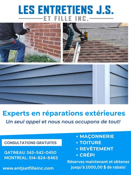Chez Les Entretiens J.S. et Fille Inc., nous offrons des services spécialisés en toiture, installation de revêtement, terrasses, crépi, rejointoiement de briques et plus encore! Que ce soit pour une nouvelle toiture, des rénovations extérieures ou des réparations, notre équipe garantit des résultats durables et résistants aux intempéries pour les propriétés résidentielles et commerciales.
