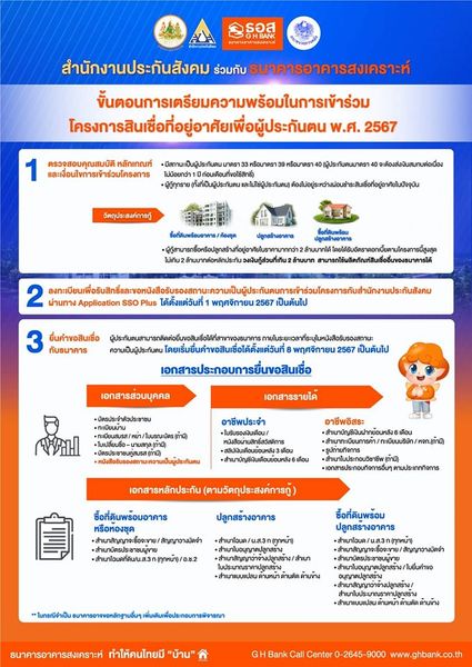 ธนาคารอาคารสงเคราะห์ (ธอส.) เปิดให้บริการยื่นกู้สำหรับโครงการประกันสังคมเพื่อที่อยู่อาศัย ผู้ประกันตนมาตรา 33,39 และ 40 ในวันเสาร์ ที่ 9 พฤศจิกายน 2567 และวันอาทิตย์ที่ 10 พฤศจิกายน 2567