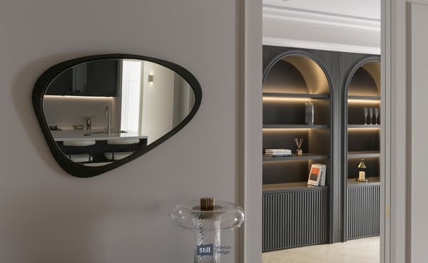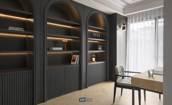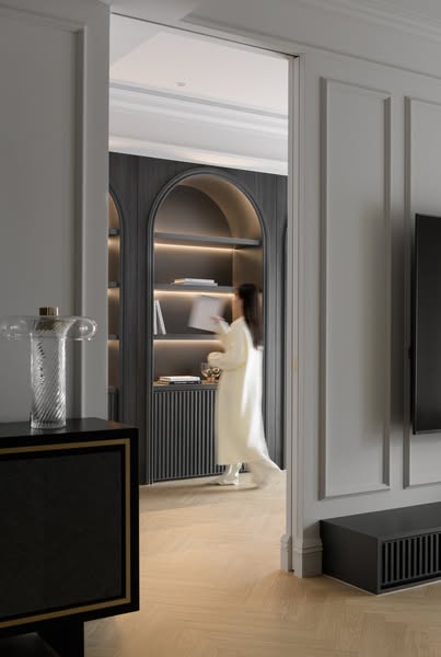 空間中融入了法式線板元素,細節設計賦予了空間獨特的風采和韻味。大面積留白的配色與黑色、金色的點綴交相輝映,營造出了極具現代感和奢華感的氛圍。空間充滿了生活的氣息,開放式的廚房貼合了屋主的生活開放需求,書房以敞開與門片阻隔的方式,滿足了不同場合的使用需求。白色與線板的搭配展現出法式極簡的風格,使整個空間顯得更加純淨、優雅。