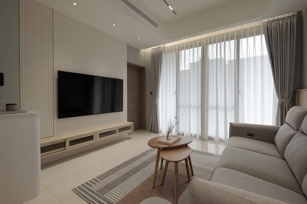 電視牆則以淺米色石材收邊,透過導圓與溝槽手法,