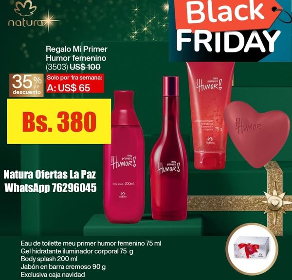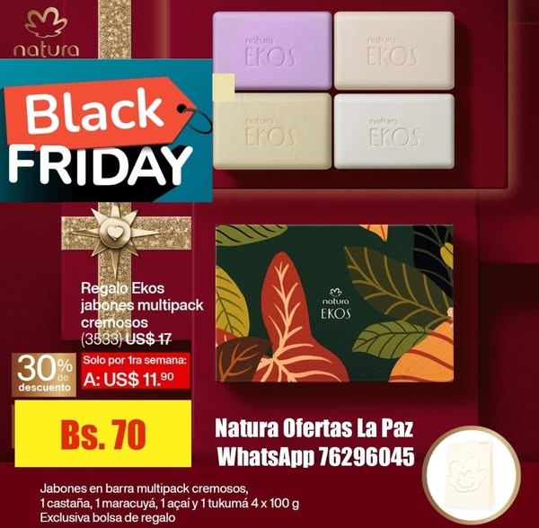 📣📣📣Atención La Paz!!! Llegaron las mejores ofertas del año. BLACK FRIDAY todo NOVIEMBRE!!! Aprovecha estos descuentos y obtén los precios mas bajos por productos Natura con la calidad de siempre ✨️ Tenemos packs de regalos con descuentos y ofertas únicas!!! Perfectos para consentirte y consentir a los tuyos. Productos para el cuidado de tu piel desde la limpieza Jabones cremosos, exfoliantes, jabones líquidos, hasta la hidratación óleos corporales, cremas corporales nutritivas, además perfumes, hidratantes faciales, protectores solares para toda la familia!!! con super descuentos!!