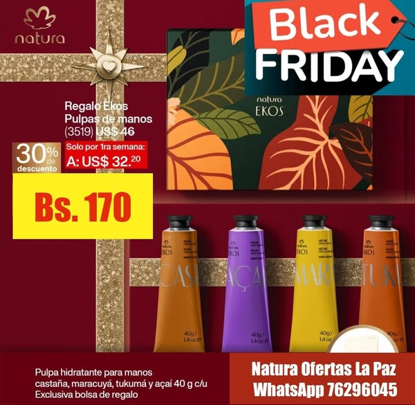 搜索关键词 Natura products, Black Friday, Bolivia, Skincare offers, Vegan cosmetics, Amazonian ingredients, Refillable products, La Paz delivery, Sustainable beauty, Personal care discounts优势 Black Friday discounts,High-quality Brazilian products,Sustainable and vegan options,Environmentally friendly (recycled materials, refills)