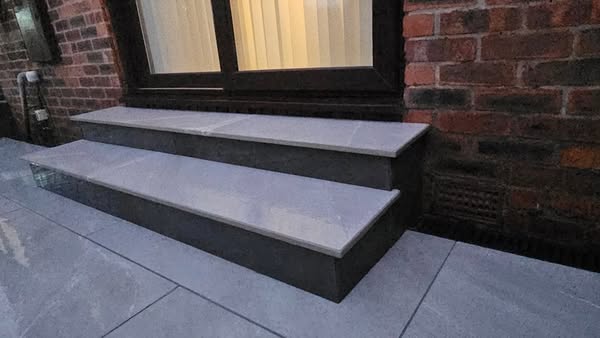 The result, 1200x 600 chorus silver Italian porcelain, which looks absolutely magnificent, finished with matching steps, and anthracite mitred step upstands to create even more of a feature.