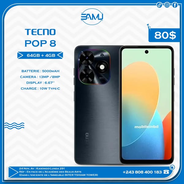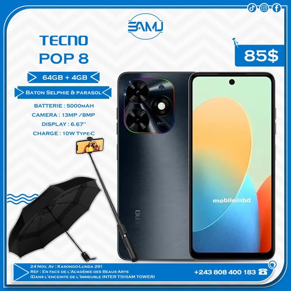 , voir Immeuble TSHIAM TOWER,N.B : LE SHOP SAMU AVEC UN GROS LOGO TECNO, Demandé la localisation pour plus de précision. +243808400183